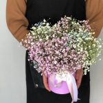 Цветная Гипсофила в шляпной коробочке с топпером «сердце»