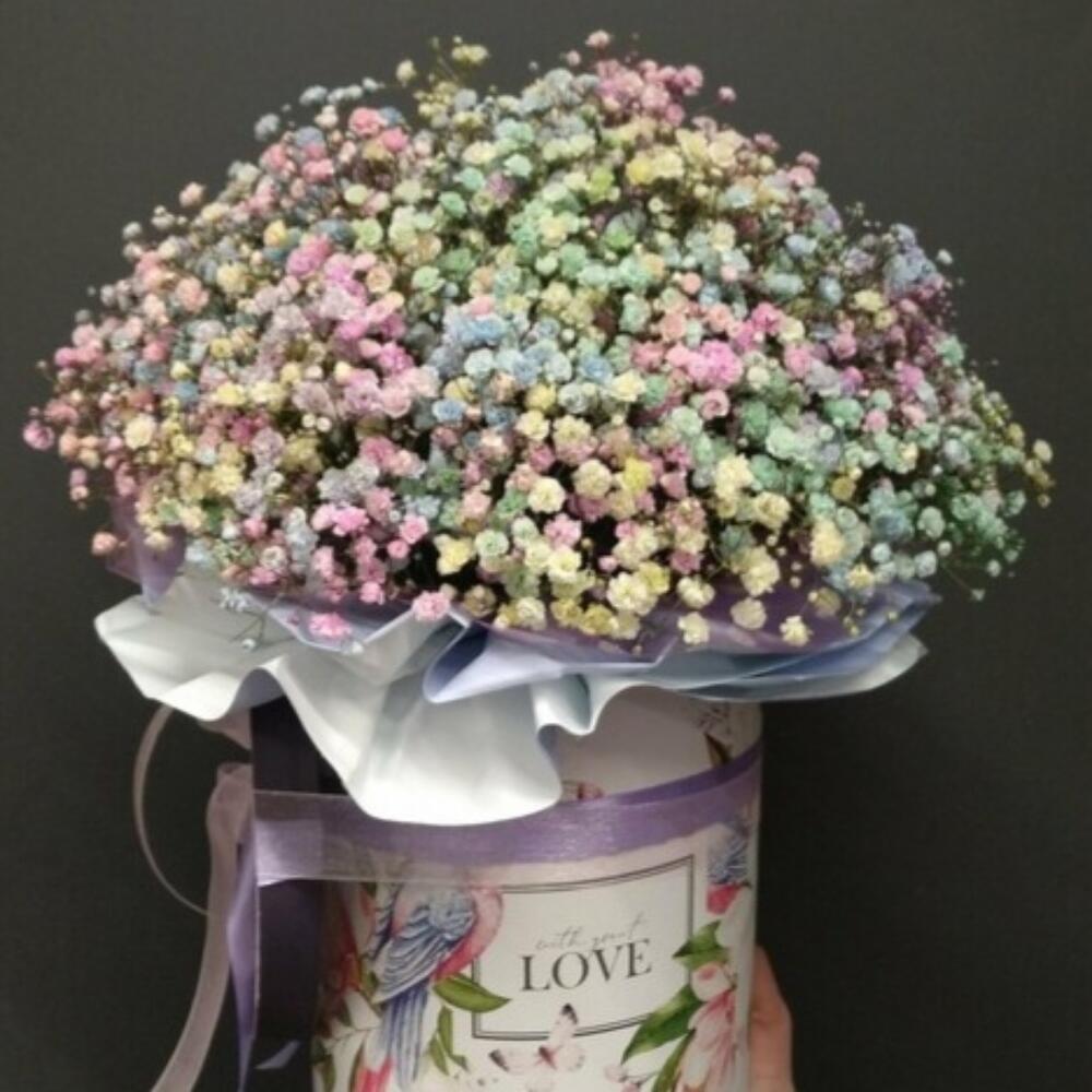 Гипсофила – 11 шт.Коробка шляпная – 1 шт.Лента атласная – 1 шт.