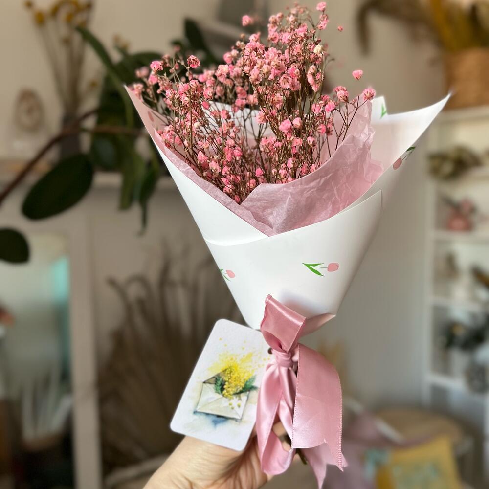 НЕ ЗАВЯНЕТНЕ НУЖНА ВОДАНАТУРАЛЬНЫЕ ЦВЕТЫБукет из стабилизированной гипсофилы.Обычная гипсофила через неделю засыхает, цветочки становятся менее привлекательными.Стабилизированные цветы же останутся такими же и спустя год.Букет не нужно ставить в воду. Стабилизированные цветы – это живые, которые сразу после срезки поместили в специальную жидкость на основе глицерина. Процесс нахождения в нём называют стабилизацией.В результате процесса цветок сохраняет свой первоначальный внешний вид на долгое время. Лепестки эластичные и не сухие!РАЗМЕРЫ:Ширина с упаковкой 21 см, высота 29 смВ подарок к заказу идет открыточка на пару слов.Дизайн подбираю под повод:)