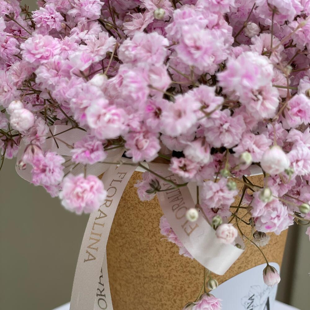 “Сиреневый туман” – композиция из гипсофилы в шляпной коробке
