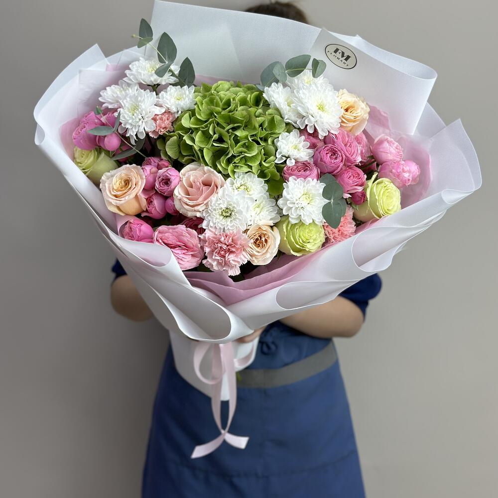 Альстромерии, Гвоздики, Кустовые розы, Лизиантусы, Розы, Хризантемы