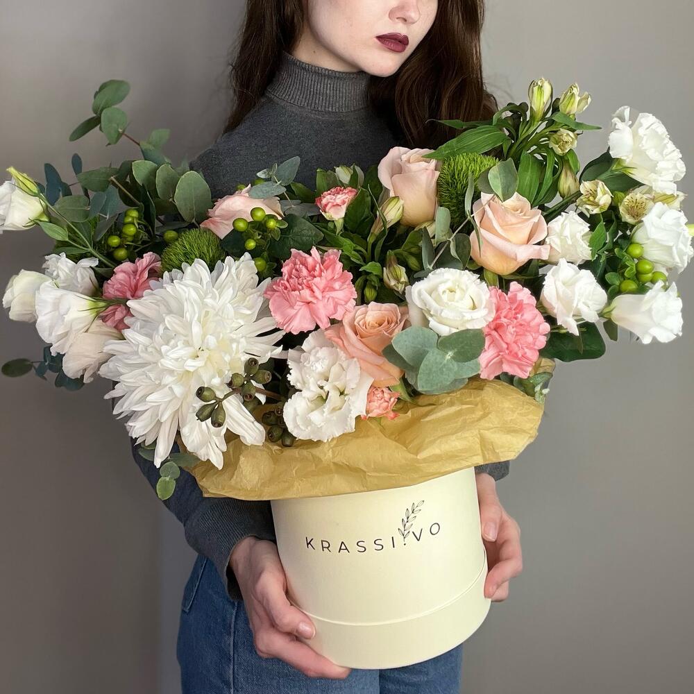 Шляпная коробка – 1 шт. Лизиантус – 4 шт. Хризантема – 1 шт. розы – 3 шт. Диантус – 5 шт. Альстромерия – 2 шт. Эвкалипт – 2 шт.