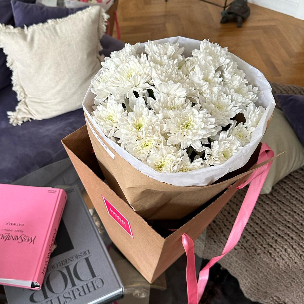 Хризантема – 5 шт.Открыточка с вашими пожеланиями – 1 шт.Транспортировочная коробка – 1 шт.Упаковка дизайнерская – 1 шт.подкормка для стойкости цветов – 1 шт.