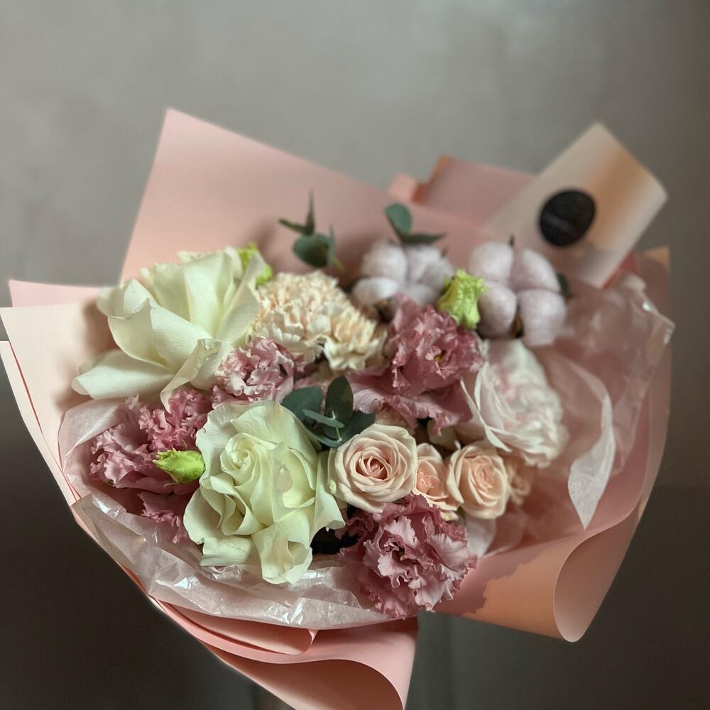 Хлопок – 3 шт.Диантус – 3 шт.Кустовая роза – 2 шт.Пионовидная роза – 1 шт.Одноголовая роза – 2 шт.Лизиантус – 2 шт.декоративная упаковка – 1 шт.Атласная лента – 1 шт.