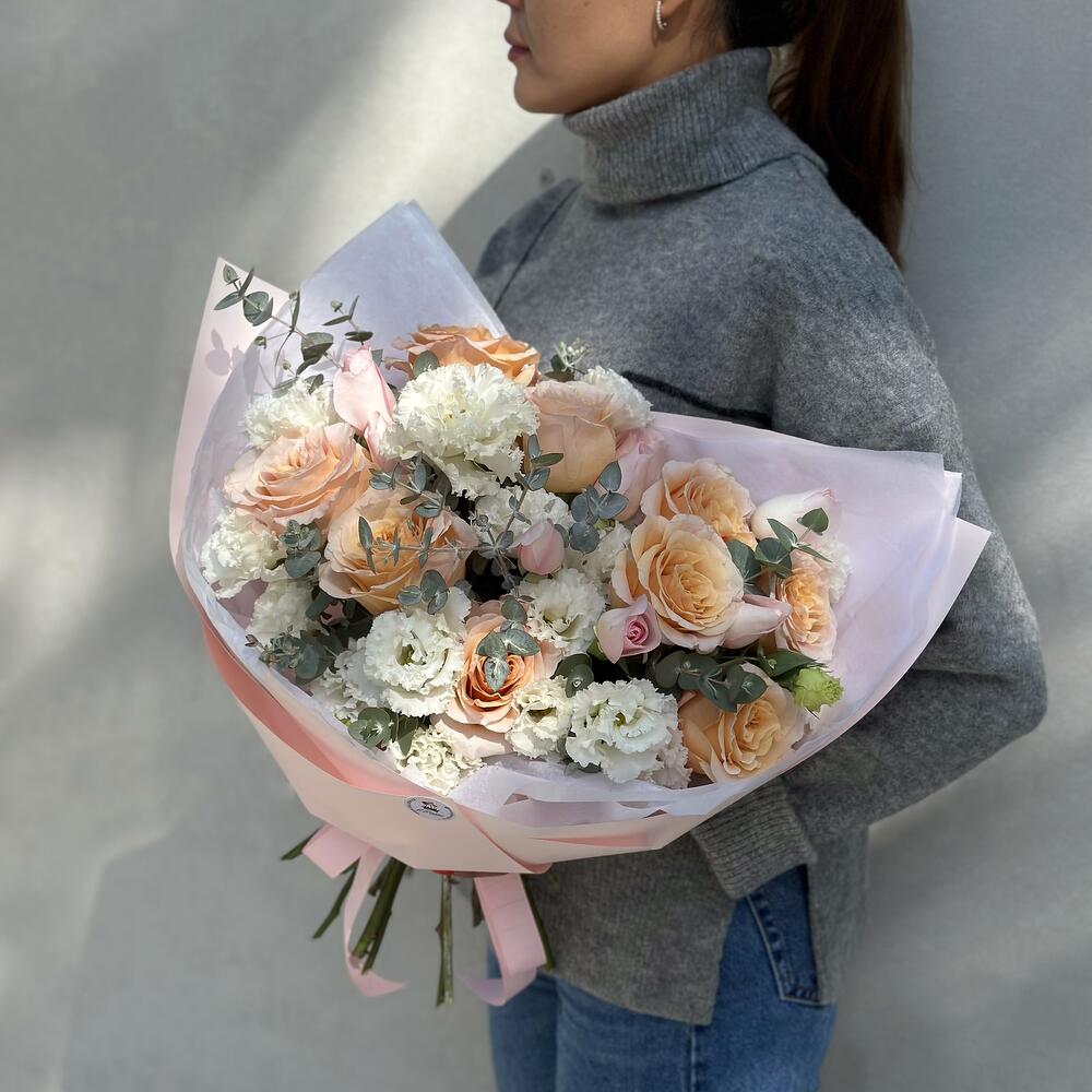 Ароматная радужная гипсофила в кашпо. Букет 119 ALMOND ROSES