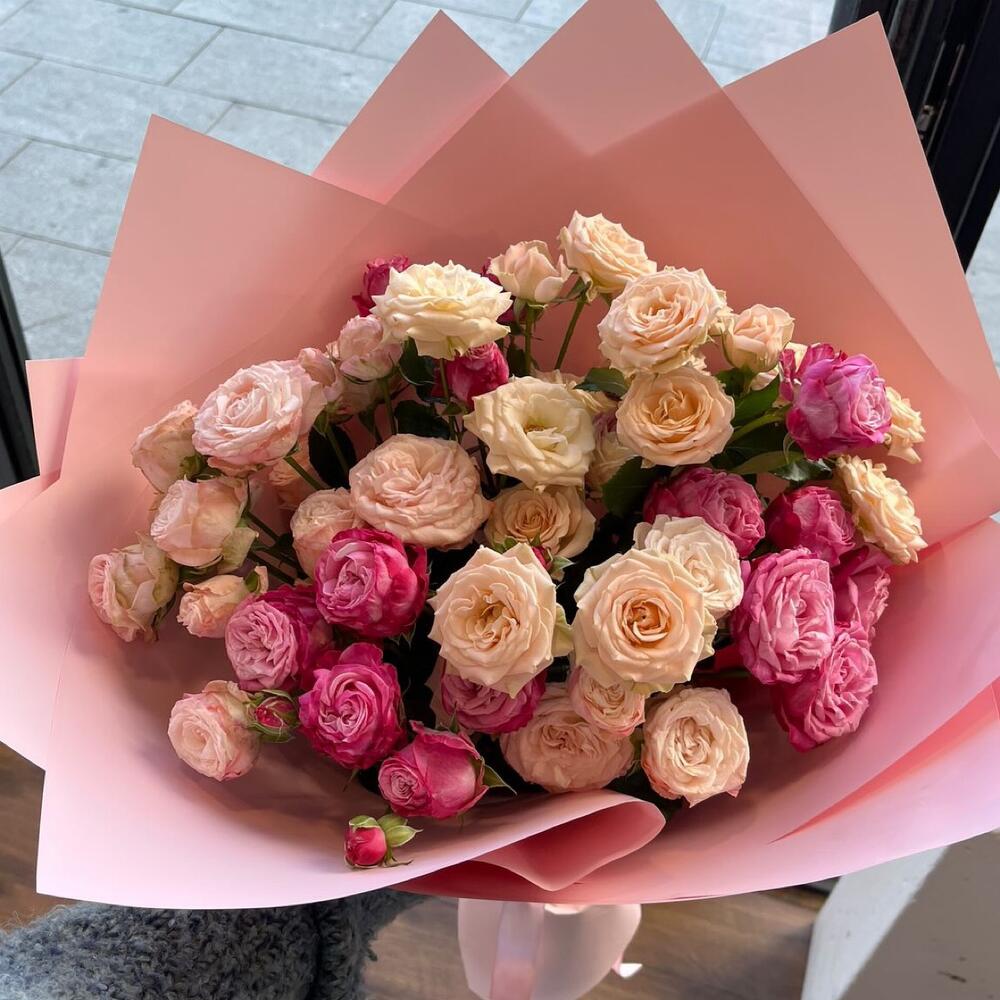 Альстромерии, Гвоздики, Кустовые розы, Лизиантусы, Розы, Хризантемы