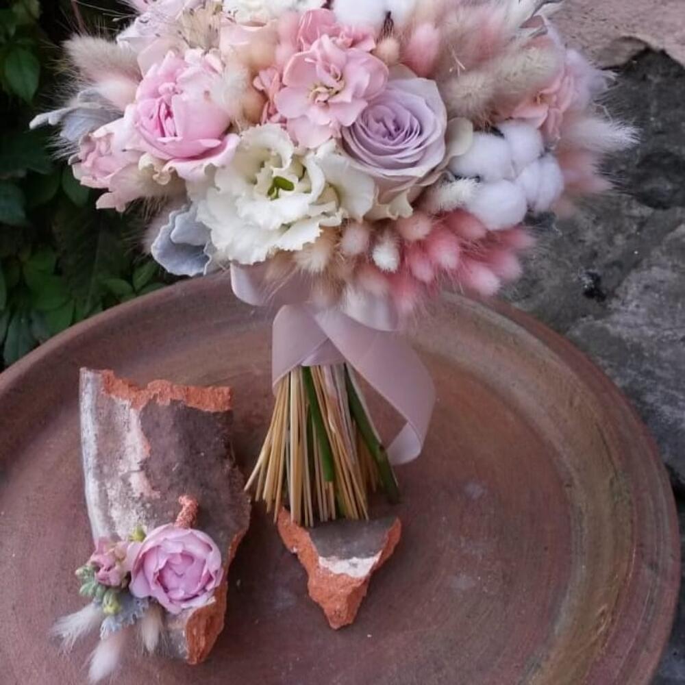 Лента – 2 шт.Лизиантус – 1 шт.Маттиола – 3 шт.Роза кустовая – 3 шт.Роза – 3 шт.Цинерария – 2 шт.Хлопок натуральный – 5 шт.Лагурус (сухоцвет) – 70 шт.