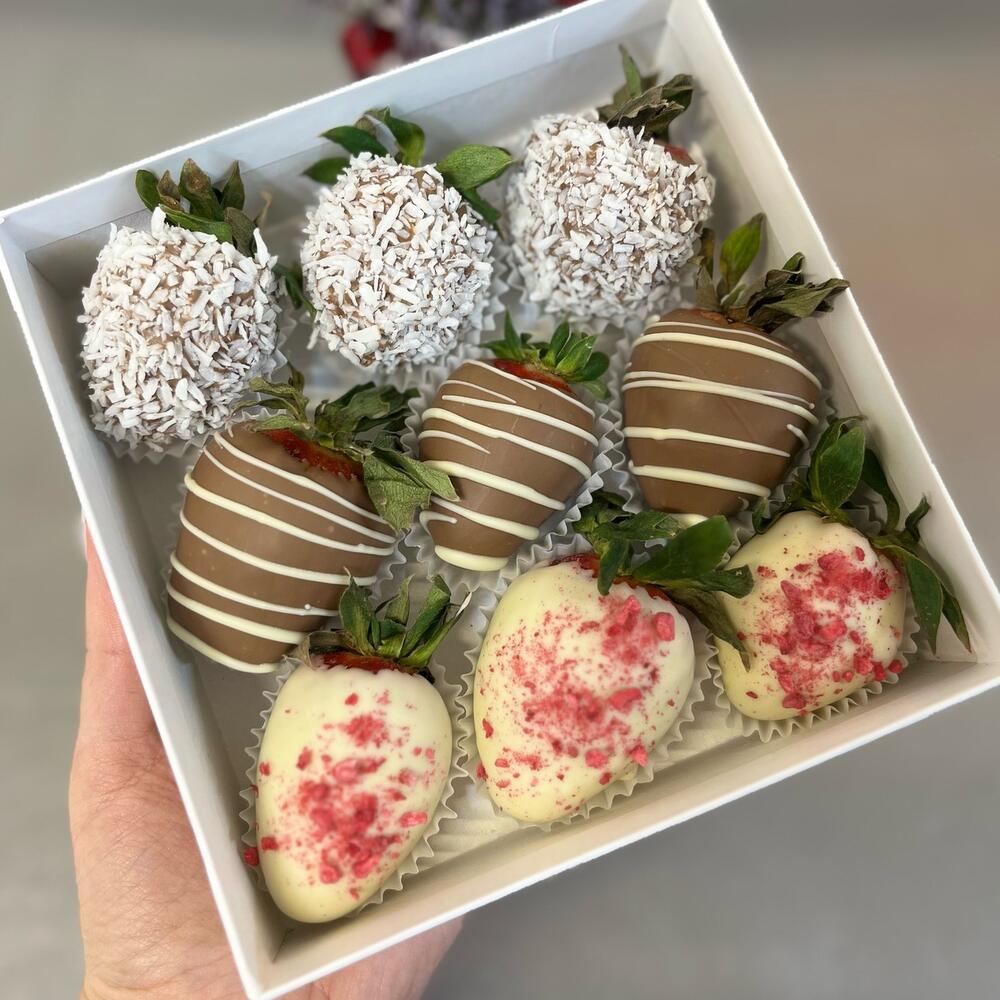 Шкатулка с розами и свежей клубникой в бельгийском шоколадеБукет который удивит получателя своей красотой и порадует необычным десертом Размер коробочки 15*15 смВысота композиции около 30 смВ выдвижном ящике клубника в белом и молочном бельгийском шоколаде с посыпками: кокосовая стружка, сублимированная малина Дополнительно упаковывается в прозрачную пленку с бантом