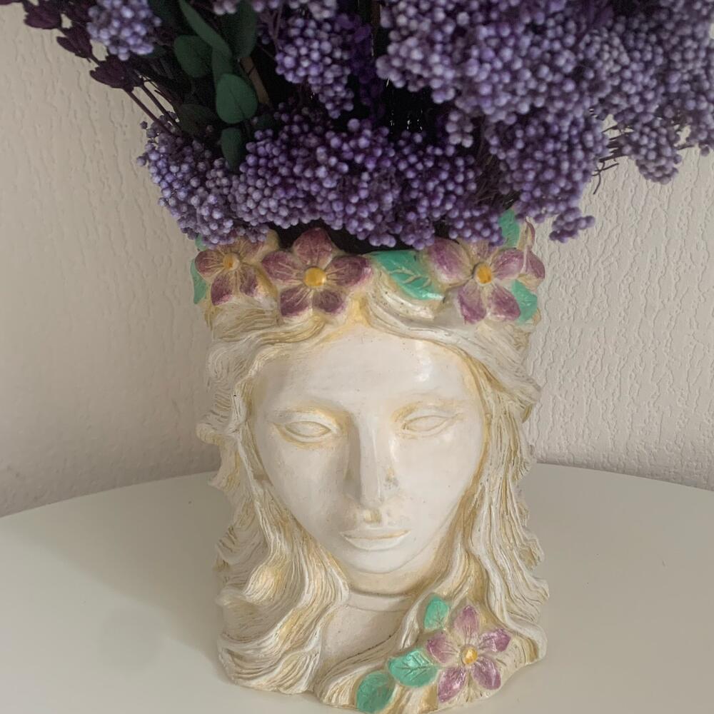 Эта стильная композиция в гипсовом кашпо ручной работы из цветов , которые очень долго не потеряют свою привлекательность станет украшением интерьера.